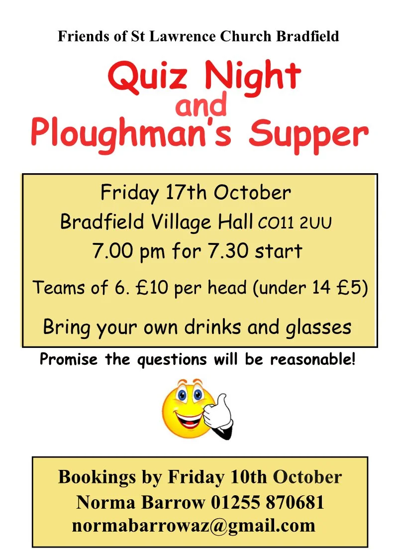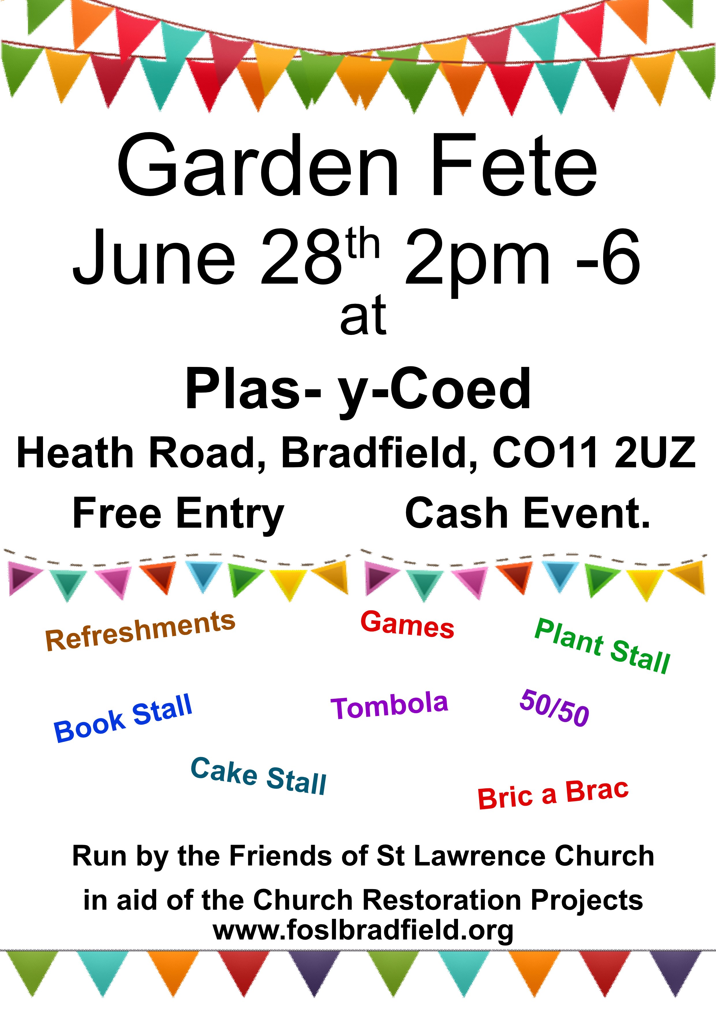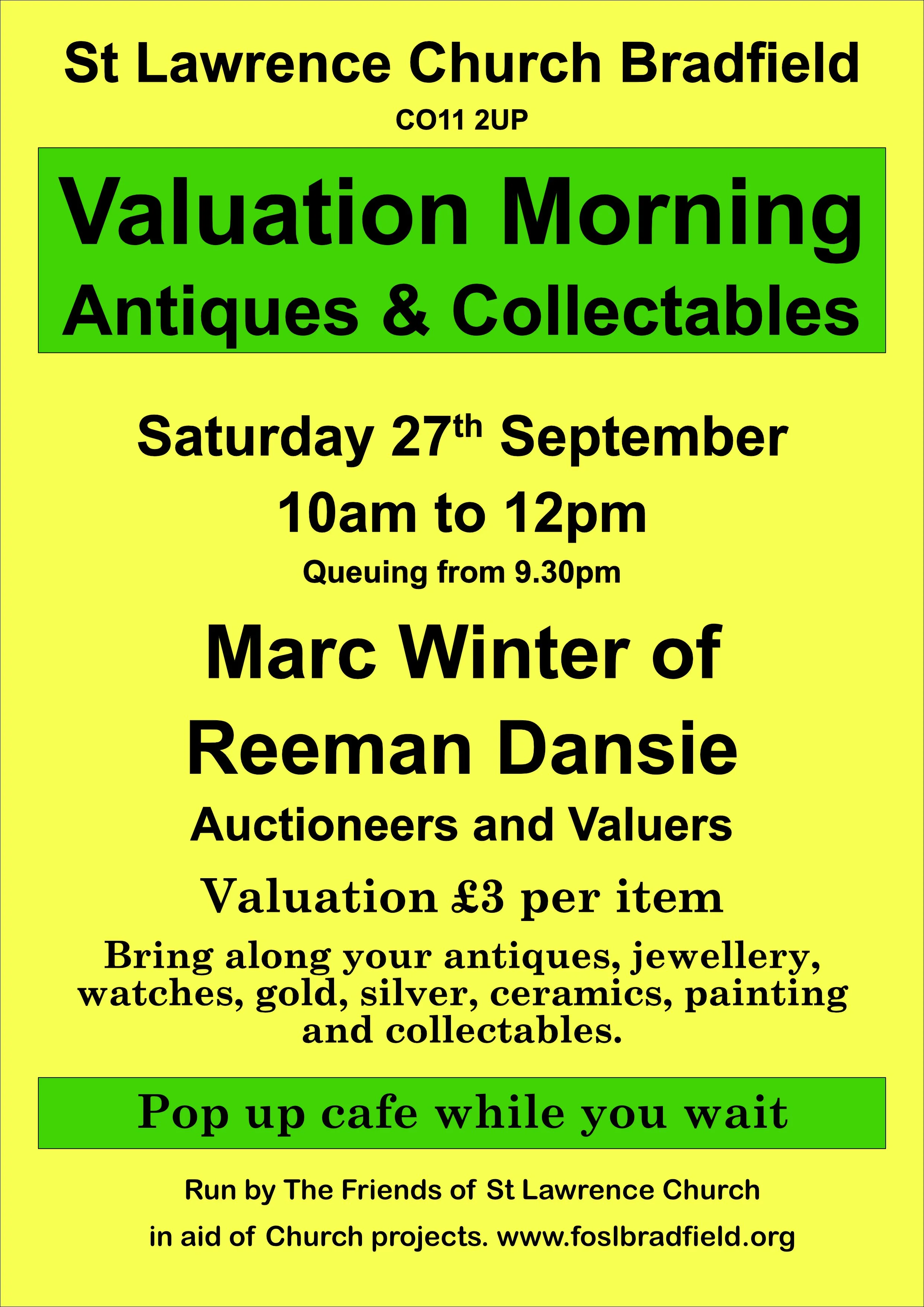 Friends of St Lawrence Church Bradfield . Our very popular Gardens Open day will be taking place on Sunday 29th June 11am-5pm. Programmes, £5 per adult (accompanied under 16 free ) may be purchased from the Village shop from mid-June and from St Lawrence Church on the day. All profits from this event will go towards maintaining our ancient church building. There are 17 venues opening, several with wonderful views of the River Stour. Details can be viewed below. Light refreshments will be available in various gardens and there will be plant and cake stalls. The Knit and Knatter group, which meets at the church, will also be running a stall.